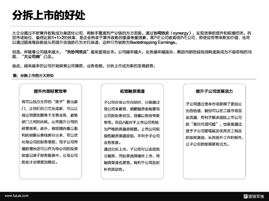 子公司通过资本市场获得了更加公允的估值,股份可以在二级市场自由流通,有利于解决困扰上市公司的“委托代理问题”,也就是通过授予子公司管理层及优秀员工相应的股权激励,从而提升工作积极性,让子公司的发展更有活力。