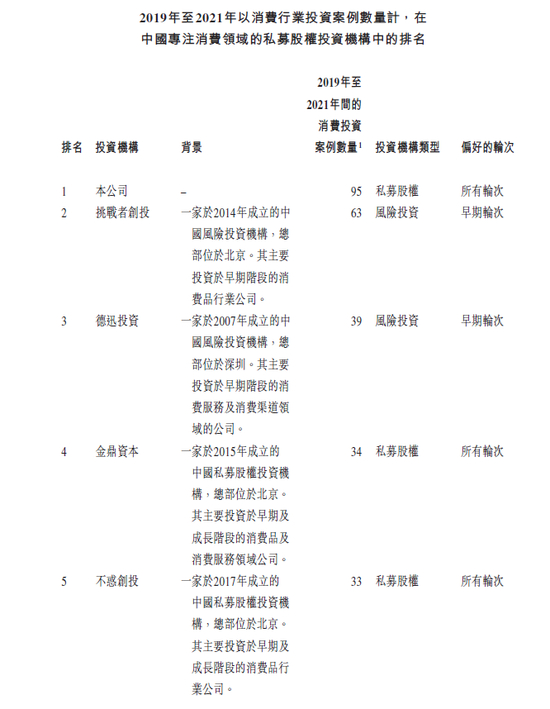 根据灼识咨询的资料,天图投资是中国第一家专注于消费的投资公司,十多年来一直专注于消费行业投资。自2019年至2021年,天图投资每年在中国消费行业的投资案例数量,在所有专注消费领域的私募股权投资机构中连续排名第一,在所有私募股权投资机构中连续排名第三,仅次于腾讯投资、红杉中国。