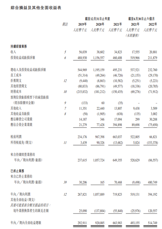 招股书显示,在过去的2019年、2020年、2021年三个财政年度和2022年前六个月,天图投资的收入分别为 0.56亿、0.39亿、0.35亿和 0.21亿元人民币,投资收益分别为 4.89亿、11.57亿、4.60亿和 2.12亿元人民币,相应的净利润分别为 2.93亿、9.20亿、 6.64亿和5.15亿元人民币。