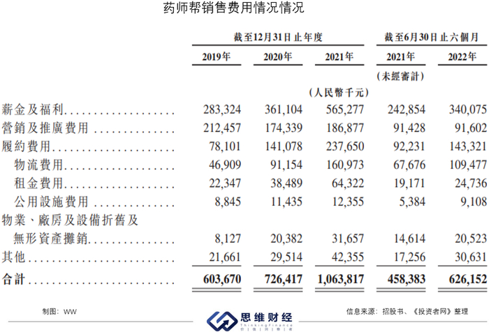 毛利率低于可比公司的同时,药师帮的销售费用率却居高不下,2021、2022年上半年期间,公司的销售费用率普遍维持在9.3%以上。其中今年上半年的销售人员薪酬就高达3.4亿元,物流成本达到1.09亿元。A股27家医药流通企业的销售费用率中位数为4.9%,超过9%的医药流通企业仅百洋医药(301015.SZ)、浙江震元(000705.SZ)两家,但他们的毛利率普遍在20%以上。值得一提的是,互联网医药零售平台京东健康(06618.HK)、阿里健康(00241.HK)两家公司中,销售费用率较高的阿里健康,这一指标也仅7.46%。