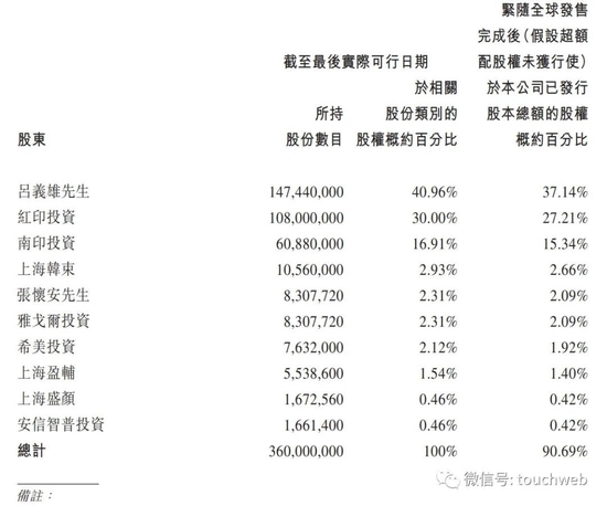 IPO后,吕义雄直接持股为37.14%,红印投资持股为27.21%,南印投资持股为15.34%,上海韩束持股为2.66%;