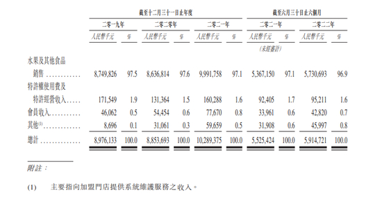 根据招股书,百果园的收入构成包括水果及其他食品销售、特许权使用费及特许经营收入、会员收入和其他,其中,其他主要指向加盟门店提供系统维护服务的收入。