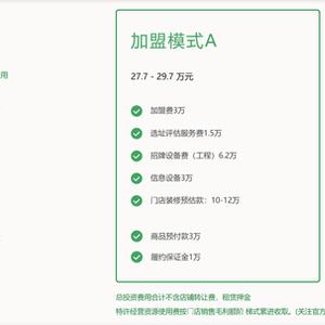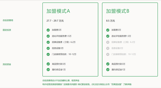 贝壳财经记者通过百果园官网加盟模式看到,一家百果园加盟店的总投资费用在8.5万元至29.7万元。其中,加盟费为3万元,此外还涉及选址评估费用,招牌设备以及门店装修等多种费用,投资从1万元到12万元不等。同时,总投资费用不含店铺转让费和租赁押金。