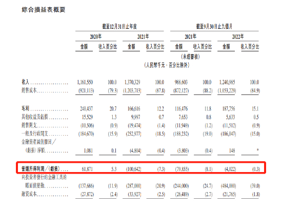 即使扣除金融工具带来的账面浮亏,公司营业利润依然处于亏损状态。根据公司财报,2020年至2022年前9个月,公司营业利润分别盈利6187万,亏损1个亿,亏损402万。