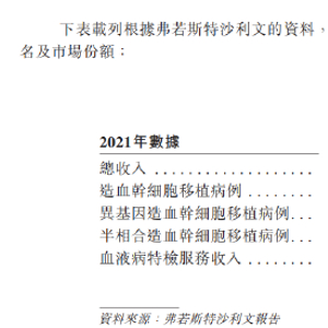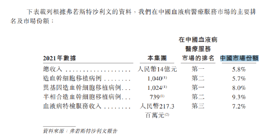根据弗若斯特沙利文资料,按2021年的造血干细胞移植病例数计算,陆道培于中国排名第二,就2021年血液病特检服务产生的收入而言,公司还是该项服务的中国第三大提供商。