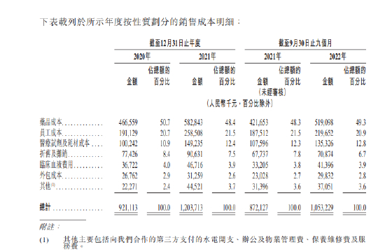 陆道培亏损背后,一方面公司毛利率较低,销售成本高达85%;另一方面则是因为公司高昂的行政开支,2022年前9月毛利1.88亿,行政支出1.86亿。就销售成本来看,公司大部分成本来自药品成本、员工成本以及医疗试剂及耗材成本。
