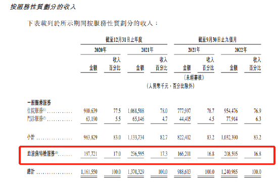 毛利率低至15%背后,公司一直声称是中国最大的血液病医疗服务提供商,但公司绝大部分收入来自一般医疗服务,占比高达83%,毛利率低至个位数,而高毛利的血液病特检服务收入占比只有16.8%。
