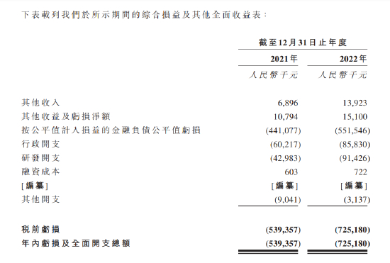 产品尚未实现商业化,行政开支、研发开支持续增加,带来的后果就是公司亏损的不断扩大。2021年亏损额高达5.39亿,2022年亏损进一步扩大至7.25亿元,两年时间亏损逾12亿。截至目前,公司拥有人累计亏损高达15.21亿元。