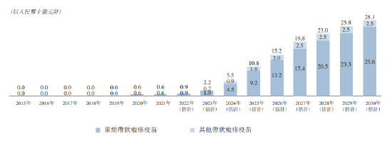 按销售收入计中国 的带状疱疹疫苗市场从2015年的零增至2021年的人民币6亿元,并预计从2021年至2025年按103.8%的复合年增长率增长至2025年的人民币108亿元,及从2025年至2030年按21.1%的复合年增长率进一步增长至2030年的281亿元。