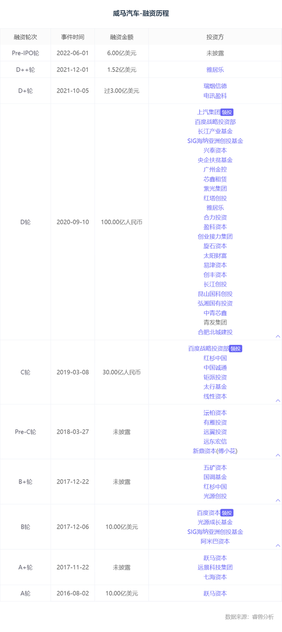 睿兽分析的信息显示,包括SIG海纳亚洲创投基金、电讯盈科、雅居乐、五矿资本、新鼎资本、上汽投资、百度、红杉中国等多家知名投资机构,参与了威马的多轮融资,总额超过300亿元人民币。