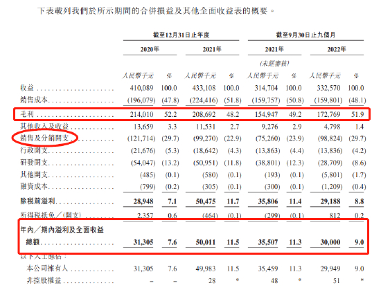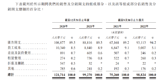 2020年、2021年及2022年前9个月,销售及分销开支分别为1.22亿、0.99亿、0.99亿,其中,2022年前9月销售及分销开支大幅增加31.3%,且销售及分销开支占比近乎30%。在销售及分销开支中,广告开支高达9成,分别为1.09亿、0.89亿以及0.93亿,不到3年广告砸了近3亿。