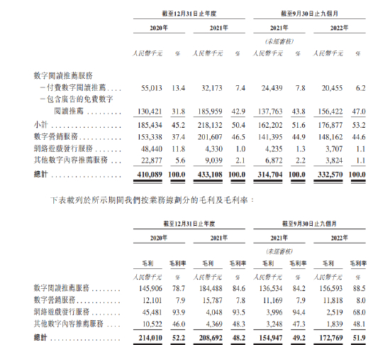 其中,数字阅读推荐服务贡献了公司逾一半的收入,数字营销服务贡献公司收入逾4成,两者基本贡献了公司98%的收入。
