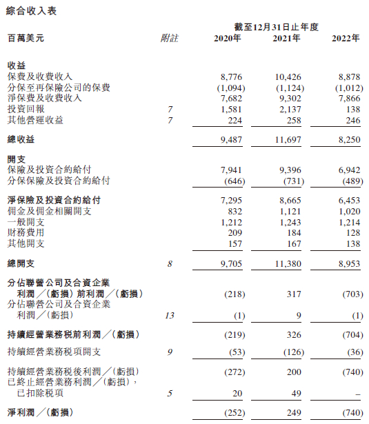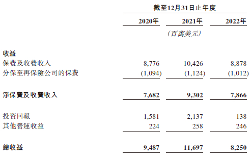 招股书显示,在过去的2020年、2021年和2022年三个财政年度,富卫集团的总收入分别为94.87亿、116.97亿和82.50亿美元,相应的净利润分别为-2.52亿、2.49亿和-7.40亿美元。