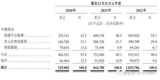 货拉拉2022年来自中国境内的收入为9.36亿美元,其中,货运平台服务营收为5.66亿美元,占营收比例为54.7%;