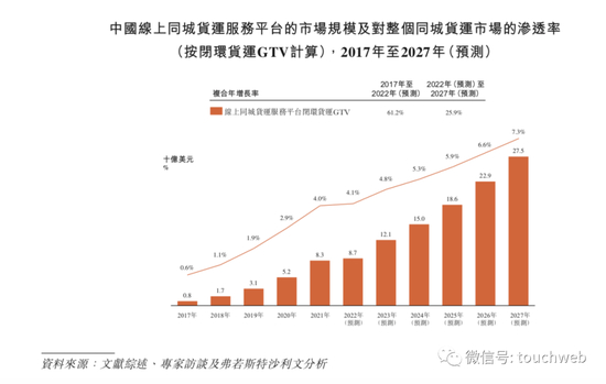 根据弗若斯特沙利文资料,2022年该市场GTV为2132亿美元,预计2022年至2027年以12.1%复合年增长率增长;同时中国同城货运市场的线上渗透率仍处于较低水平,线上渗透率预计由2021年的4%提升至2027 年的7.3% 。