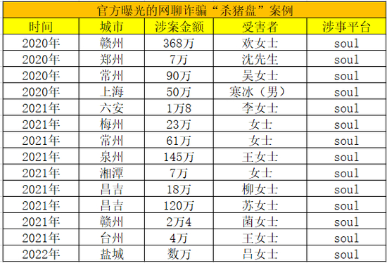 据不完全统计,目前与Soul有关的杀猪盘骗局已被曝光多达几十起,诈骗金额从几万元到几百万元不等,而这还仅仅是公安部门公布在网上的典型杀猪盘案例。