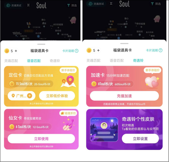 小编登上Soul,便有“同城卡/加速卡/定位卡”选项,点击发现在语音匹配下方,定位卡可以切换定位匹配远方灵魂,新手体验价15 soul币一次,原价则要25 soul币;