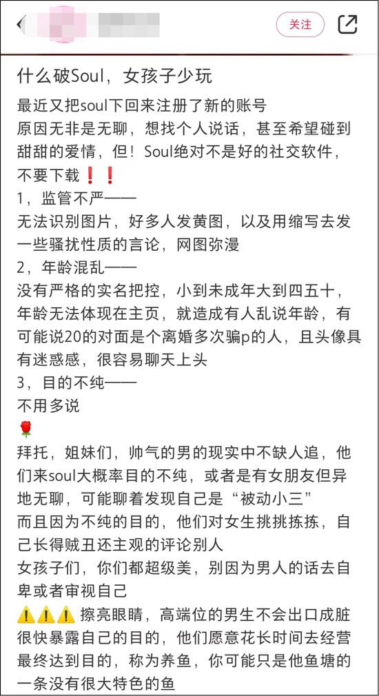 3月13日,一位用户发出了“什么破Soul,女孩子少玩”的感叹,“有可能说20的对面是个离婚多次骗p的人。”
