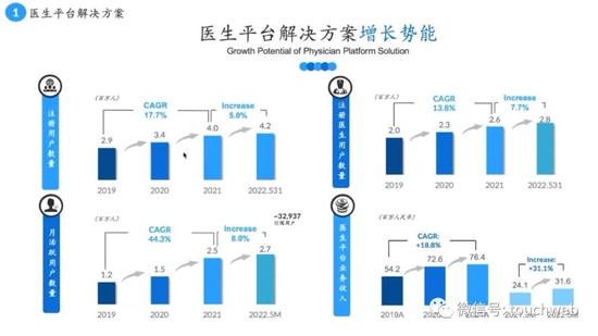 接着是业务增长情况。第一块是医生平台解决方案业务。普通注册用户及医师用户的增长基本都在10%以上,医生活跃度的增长速度也相当可观,面向医生的平台业务收入也在持续稳定增长,每年增长率在18%左右。