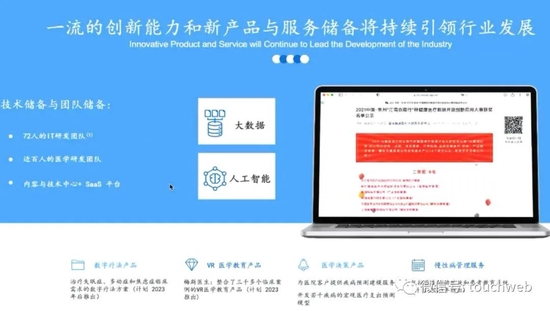 梅斯健康的业务可概括为“三加一”,即三个基础业务和一个创新领域。梅斯健康每年的研发投入都会为今后一道三年做很多储备工作,包括数字治疗产品、虚拟现实的医学教育产品、大数据建模等业务,都在向市场推出。