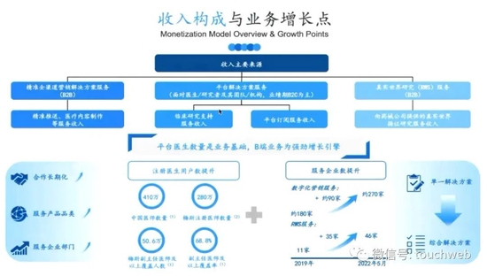 收入构成方面,主要来源于前述三个方面,第一是医生平台解决方案服务,第二是面向药企的全球精准营销解决方案服务,第三是真实世界研究解决方案服务。进一步地,关于医生平台解决方案服务,收入主要来源于临床研究支持服务和去年开始新增、发展空间广阔的平台订阅服务。