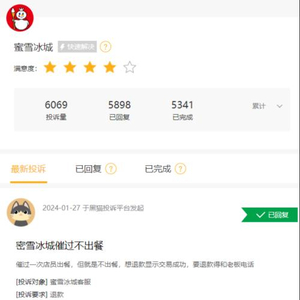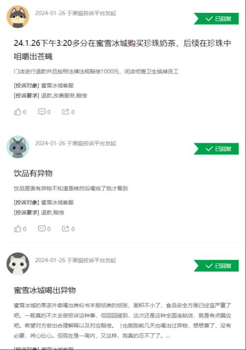 加盟门店过多的另一面,是难以回避的食安问题,据黑猫投诉,截止2024年1月28日,蜜雪冰城于该平台共拥有6069条投诉量,其中近三十天内投诉量为85条,已完成26条。多名消费者投诉吃到头发、苍蝇、蟑螂等食安问题。
