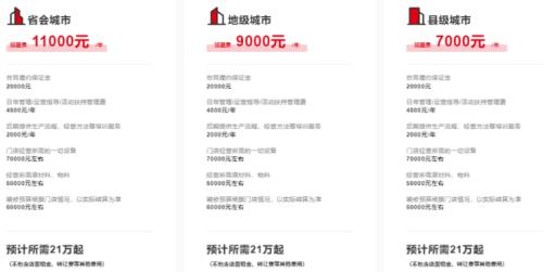 其中,省会城市、地级城市、县级城市加盟费为11000元/年、9000元/年、7000元/年。合同履约保证金为20000元,日常管理/运营指导/活动扶持管理费为4800元/年,后期提供生产流程,经营方法等培训服务费用为2000元/年,门店经营所需的一切设备费用约70000元左右,经营所需原材料、物料费用约50000元左右,装修预算根据门店情况,以实际结算为准,费用约60000元左右。整体而言,不包含店面租金、转让费等其他费用预计所需21万起。