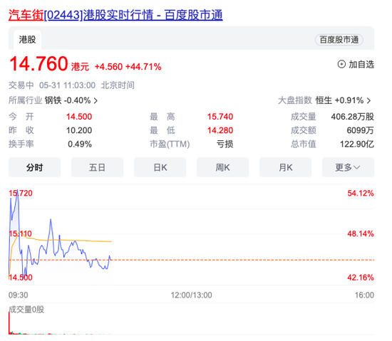 截至发稿,汽车街报14.76港元/股,市值约122.90亿港元,盘中股价最高达15.74港元/股。