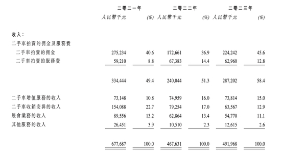 作为一家连接二手车买家及卖家的交易媒介,汽车街透过旗下交易平台以同步拍及线上拍卖两种拍卖形式促成二手车交易。2021-2023年,公司来自二手车拍卖的佣金及服务费占总收入的比例,分别为49.4%、51.3%、58.4%。