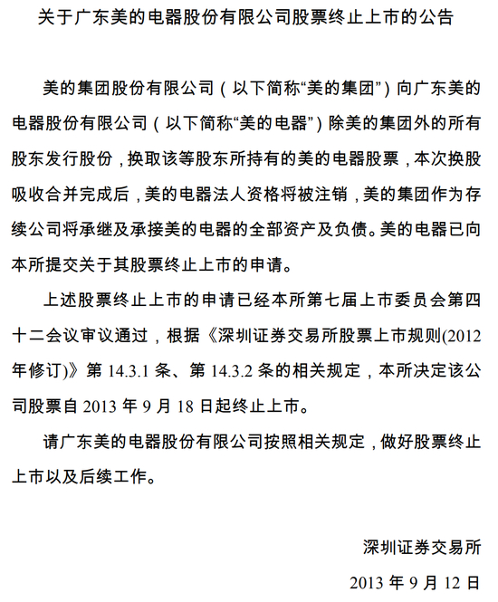 直至2013年上旬,美的电器披露《美的集团股份有限公司换股吸收合并公司报告书(草案)》等一系列公告,称美的集团将吸收合并美的电器,并将在深圳证券交易所上市。2013年6月,该事项获得审核通过,同年7月获得证监会核准。