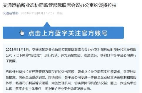 另外,2023年11月3日,交通运输新业态协同监管部际联席会议办公室约谈货拉拉,并对满帮集团、滴滴货运、快狗打车等平台公司进行了提醒。约谈针对货拉拉在经营管理方面存在的突出问题,要求货拉拉立即落实约谈要求,采取针对性措施,确保全面整改到位。约谈强调,各平台公司要进一步健全企业经营决策机制和客服体系,畅通司机利益诉求渠道,完善处理机制,切实保障司机合法权益。