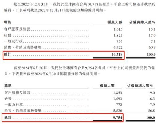 另外,货拉拉在业绩增长的情况下,其员工人数却呈下降趋势。2022年至2023年以及2024年上半年的各期期末,货拉拉员工人数分别为10718人、10152人、9754人,2024年6月30日相较2022年12月31日减少964人。