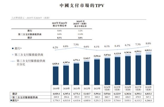 2019年至2023年,我国支付市场的TPV(交易总额)从4029.4万亿元增至5591.6万亿元,复合年增长率为8.5%;预计到2028年将达6813.1万亿元,2024年至2028年的复合年增长率降至3.8%。