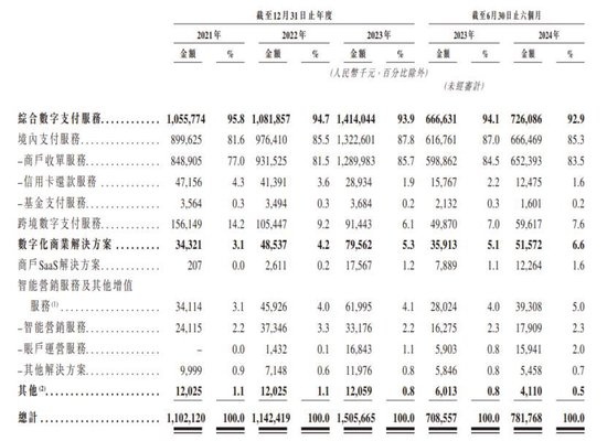 其中,综合数字支付服务又分为境内支付服务和跨境数字支付服务,境内支付服务包括商户收单服务、信用卡还款服务、基金支付服务。