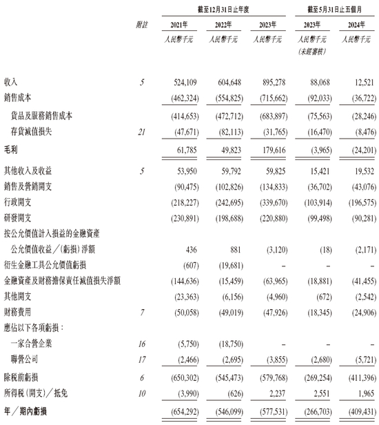 招股书显示,在过去的2021年、2022年、2023年和2024年前五个月,重塑能源的营业收入分别为人民币5.24亿、6.05亿、8.95亿和0.13亿元,相应的净亏损分别为人民币6.54亿、5.46亿、5.78亿和4.09亿元。