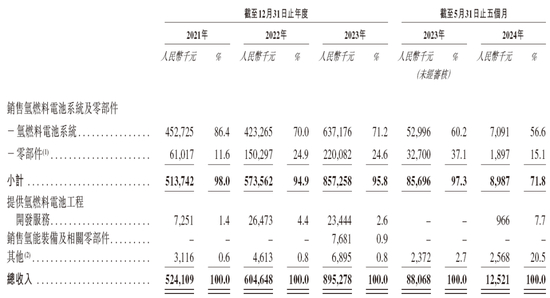 重塑能源的收入主要来自销售氢燃料电池系统及零部件、提供氢燃料电池工程开发服务、销售氢能装备及相关零部件、其他(主要包括提供售后服务)。