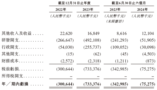 招股书显示,在过去的2021年、2022年、2023年和2024年上半年,银诺医药未有营业收入,相应的研发开支分别为人民币2.67亿、4.92亿、2.41亿和0.52亿元,相应的净亏损分别为人民币3.01亿、7.33亿、3.43亿和0.75亿元。