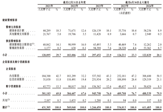 企业服务,公司提供内容服务,与外部医生及医疗专家合作,以满足数字健康企业服务市场对优质医疗内容的企业需求,包括(i)科普内容服务,(ii)精准内容服务及(iii)真实世界研究支持服务。公司也向(i)医药及医疗健康企业及(ii)医疗机构提供信息技术服务。