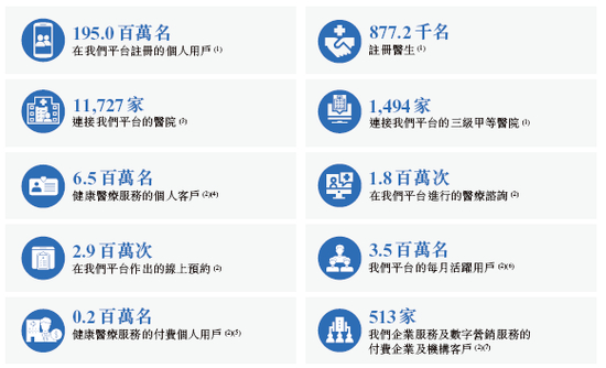 价值医疗服务,包括健康医疗综合服务包、医药零售业务。公司销售健康医疗综合服务包,向已订阅的个人用户提供的健康医疗综合服务包有两个组成部分,包括健康商品(如营养补充剂及透皮贴剂)以及及健康会员计划。医药零售业务,收入来自通过自有药房向客户销售药品及医疗设备。