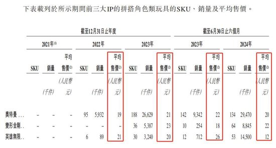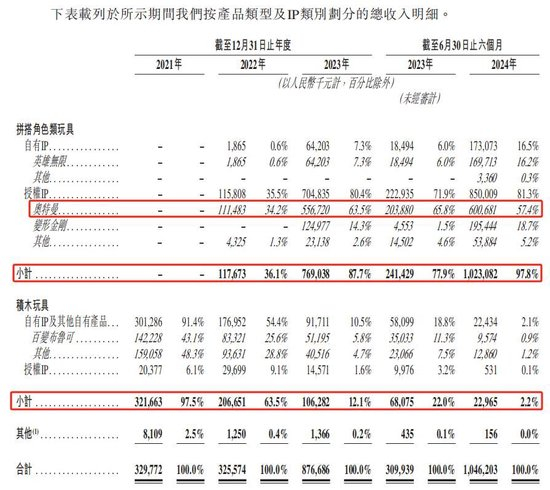 这其中,拼搭角色类玩具业务的总收入占比在显著增加,由2022年的占比36.1%陡增至2023年的87.7%,2024年上半年占比更是高达97.8。