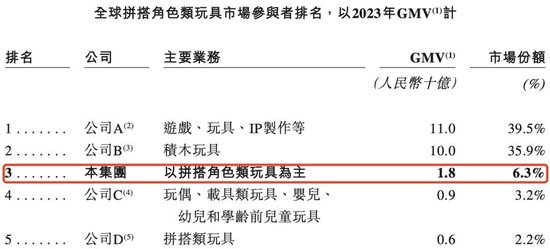 布鲁可想上市,对外讲的是“中国版乐高”的故事。在招股书中,它自称全球第三大拼搭角色类玩具公司,排在万代和乐高之后。但根据2023年GMV计算,布鲁可6.3%的市场份额,与乐高的39.5%和万代的35.9%仍有较大差距。