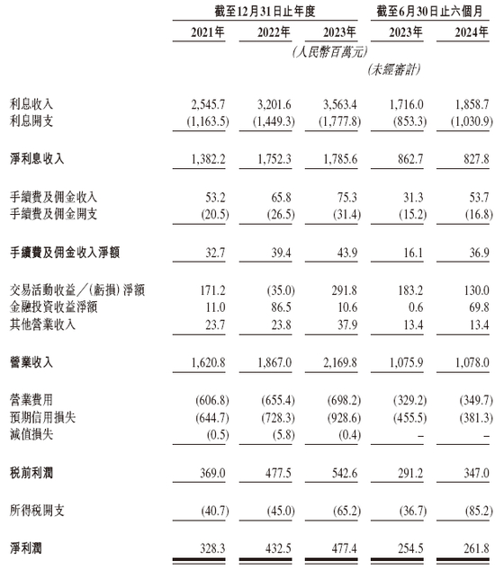 招股书显示,在过去的2021年、2022年、2023年和2024年上半年,宜宾市商业银行的收入分别为人民币16.21亿、18.67亿、21.70亿和10.78亿元,相应期间的净利润分别为人民币3.28亿、4.33亿、4.77亿和2.62亿元。
