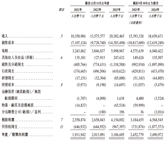 招股书显示,在过去的2021年、2022年、2023年和2024年前九个月,蜜雪冰城的营业收入分别为人民币103.51亿、135.76亿、203.02亿和186.60亿元,相应的净利润分别为人民币19.12亿、20.13亿、31.87亿和34.91亿元。