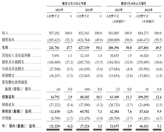 招股书显示,在过去的2022年、2023年和2024年前九个月,不同集团的营业收入分别为人民币5.07亿、8.52亿和8.84亿元,相应的净利润分别为人民币-2122.9万、2722.4万和4642.1万元,相应的经调整净利润分别为人民币977.4万、5924.7万和7357.2万元。