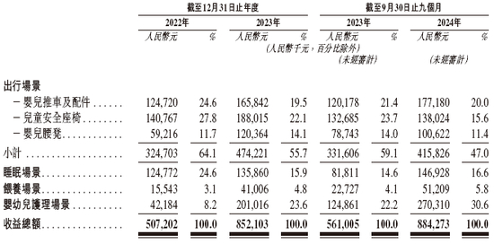 不同集团所有收入来自产品销售,包括:(i)出行场景,如婴儿推车及配件、儿童安全座椅及婴儿腰凳;(ii)睡眠场景,如婴儿床、婴儿睡袋及枕头,(iii)喂养场景,如餐椅及餐具,及(iv)婴幼儿护理场景,如纸尿裤及棉柔巾。公司结合线下和在线渠道以触达广泛消费者。在线渠道覆盖中国的主流电商平台及公司的私域平台。线下渠道主要包括向主要育儿产品零售商等分销商及KA客户销售,截至2023年9月30日,公司于123家中国分销商和2家海外分销商建立合作。