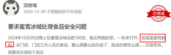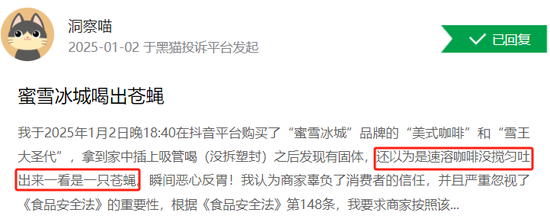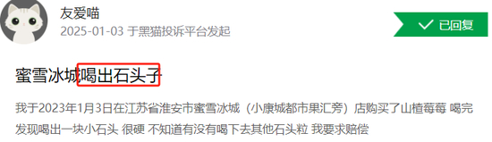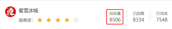 仅从第三方投诉平台黑猫投诉来看,蜜雪冰城2022年9月首次披露招股书时,该平台上关于公司的投诉量还是4000条出头,而2025年1月5日,该平台上关于蜜雪冰城的投诉量已经暴增到8500多条。这些投诉大部分与食品质量和安全相关,也有部分与服务态度和质量有关。