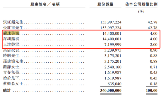 招股书显示,2020年12月,宁波梅山保税港区龙珠美城股权投资合伙企业(有限合伙)(“龙珠美城”)、深圳蕴祺投资咨询中心(有限合伙)(“深圳蕴祺”)及天津磐雪企业管理合伙企业(有限合伙)(“天津磐雪”)与蜜雪冰城及当时的股东订立投资协议,三家机构分别认购公司453.5万股、453.5万股及226.8万股股份,对价分别为9.33亿元、9.33亿元及4.67亿元,持股比例分别为4%、4%和2%。