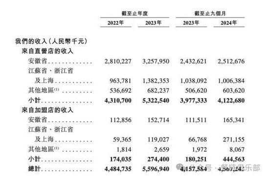 招股书显示,2024年前三季度,老乡鸡来自直营店的收入为41.23亿元,同比增长3.67%,占整体收入的比例为88.14%;同期,其来自加盟店的收入为4.45亿元,同比增长了147.22%,占整体收入的比例为9.51%。