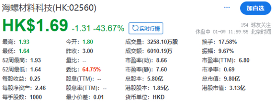 截至午间收市,海螺材料科技每股报1.69港元,总市值约9.80亿港元。