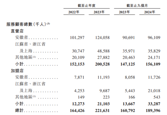 报告期内,直营店中来自“长三角”地区的收入金额分别为37.74亿元、46.40亿元以及35.19亿元,约占同期总收入的87.54%、87.17%、85.34%;加盟店中的情况也是如此。同时,服务顾客总数上,“长三角”地区以绝对优势领先其他地区,2024年前三季度,“长三角”地区门店服务了共计1.65亿人次,占比高达86.95%。